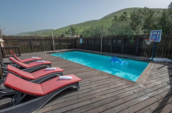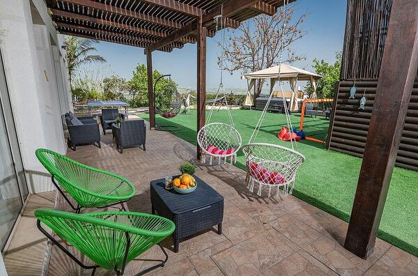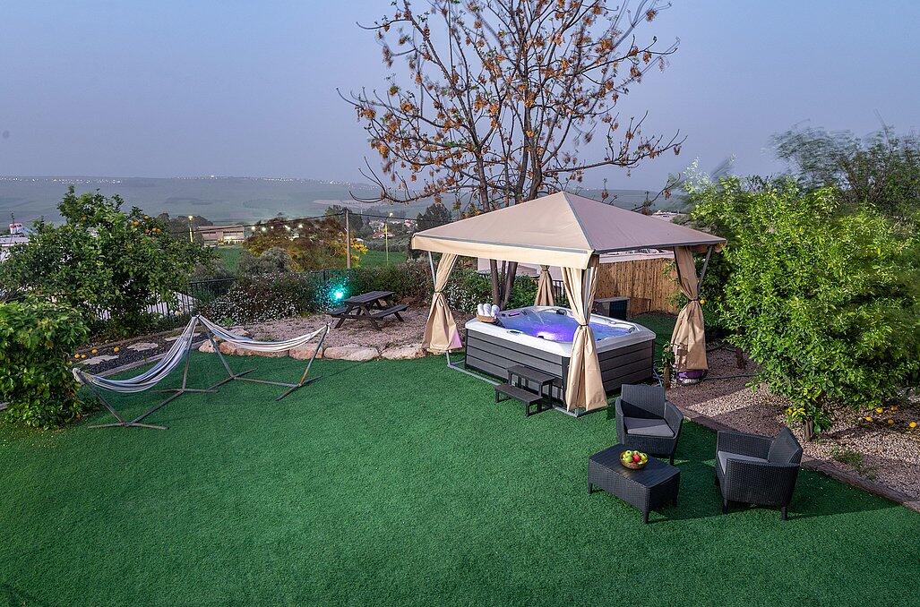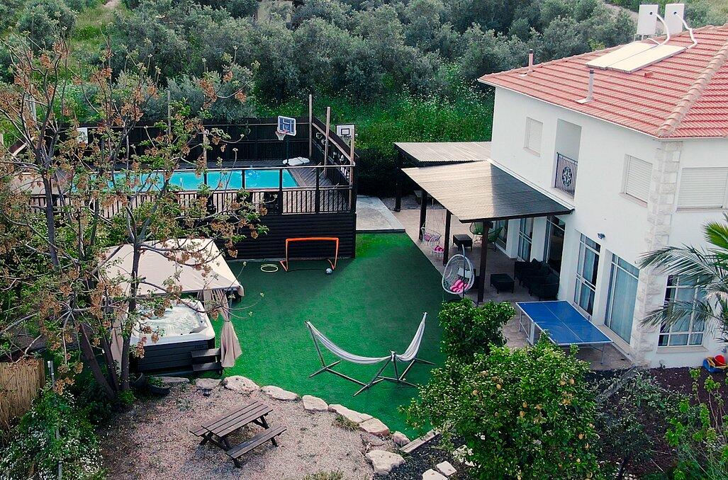 במתחם החיצוני תוכלו להנות ממדשאות ירוקות, בריכת שחייה מחוממת, ערסלים ופינות ישיבה, שערי כדורגל, כדורסל לילדים, שולחן פינג-פונג, מיטות שיזוף ועוד אטרקציות במקום.