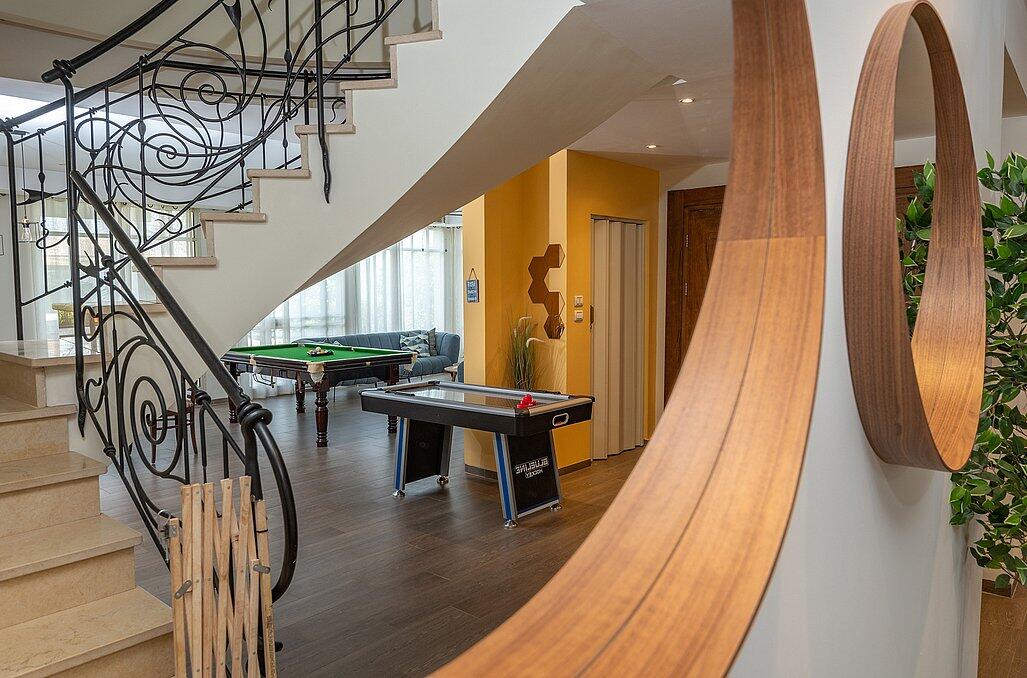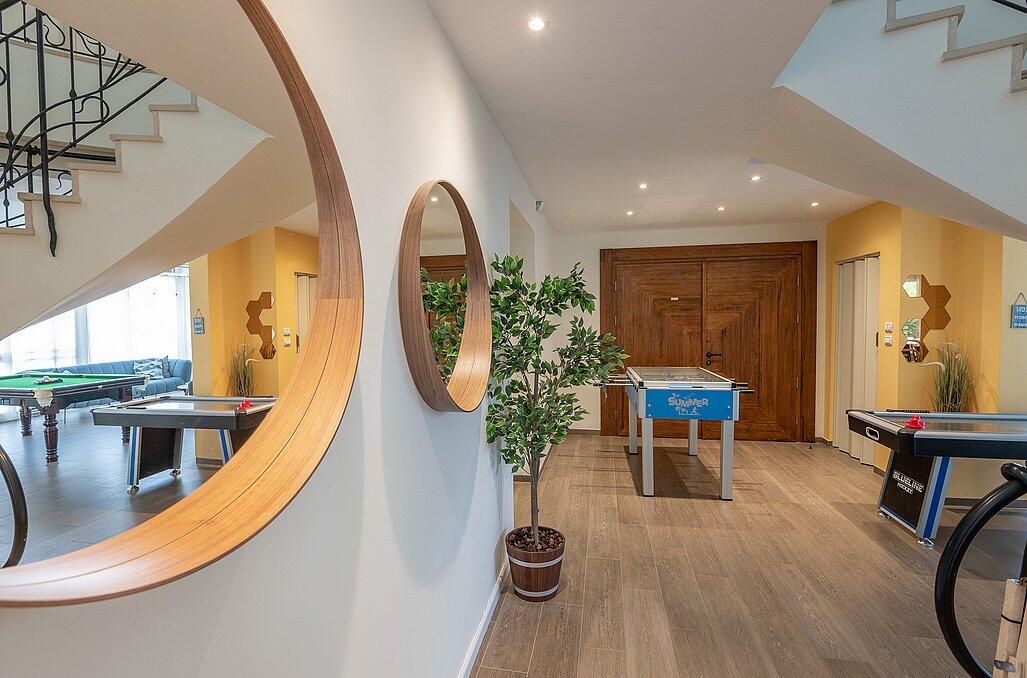 המתחם בנוי מ-2 מפלסים, ומונה בסך הכל 8 חדרי שינה מתוכם חדר ילדים אחד. בקומת הקרקע סלון מרווח עם טלוויזיה ומערכת קולנוע ביתית, פינת אוכל גדולה ומטבח מאובזר, 2 חדרי שינה זוגיים וחדר רחצה משותף. בקומה השנייה חדר ילדים ו-5 חדרי שינה זוגיים (באחד מהם 2 מיטות זוגיות), 3 חדרי רחצה ומרפסת עם פינת ישיבה ונוף מרהיב.