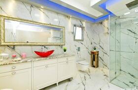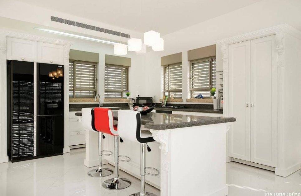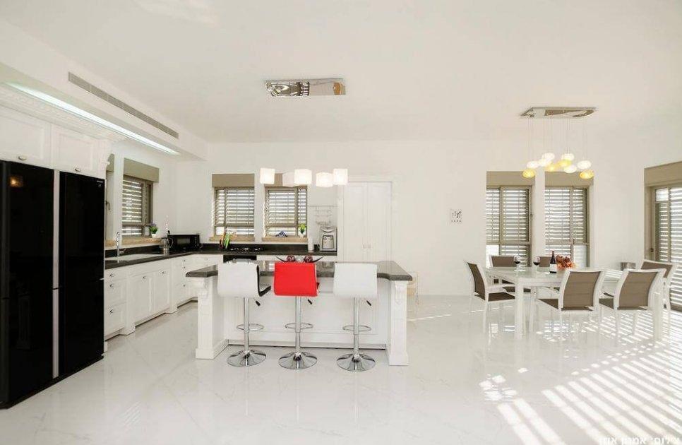 מטבח מאובזר - מקרר זכוכית ענק, מתקן לשתייה, מיקרוגל, קומקום חשמלי וכיריים גז
