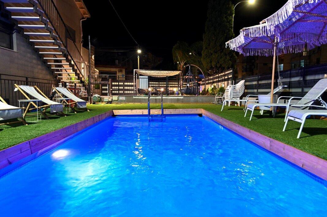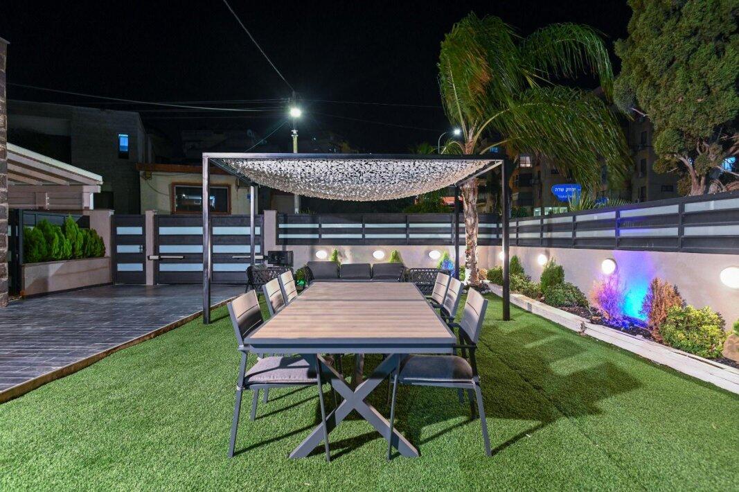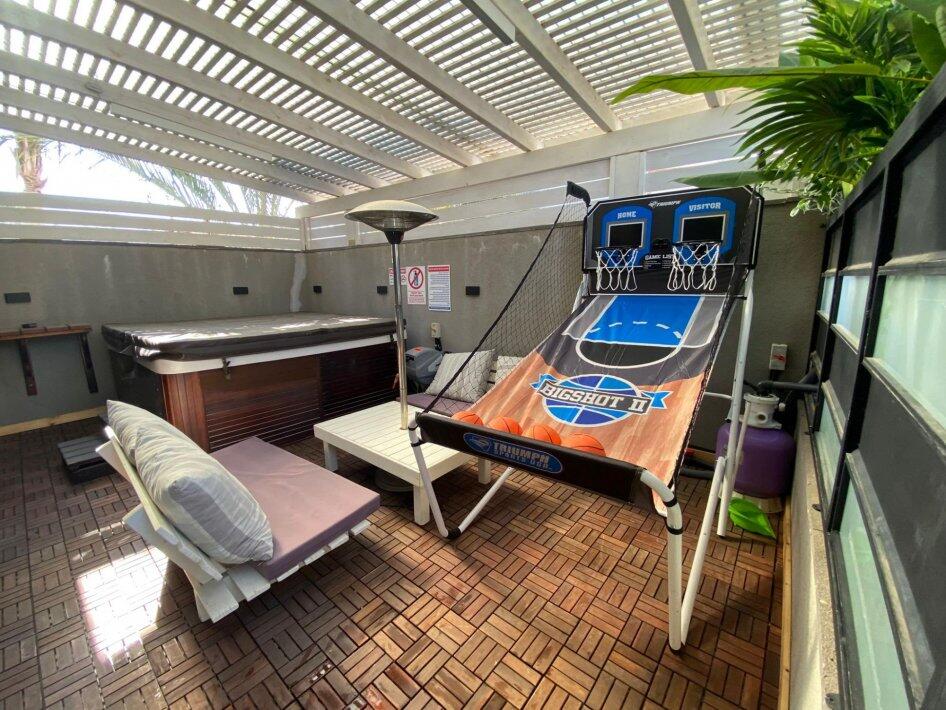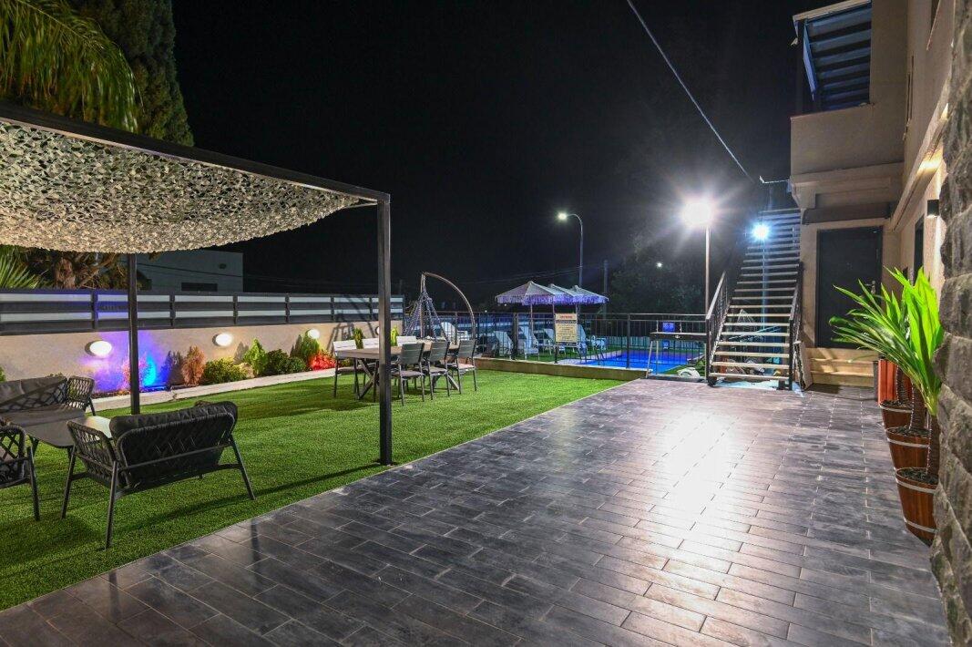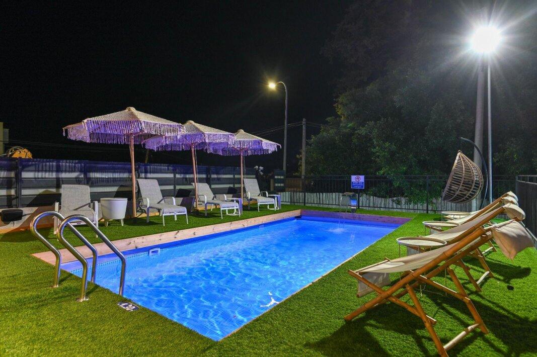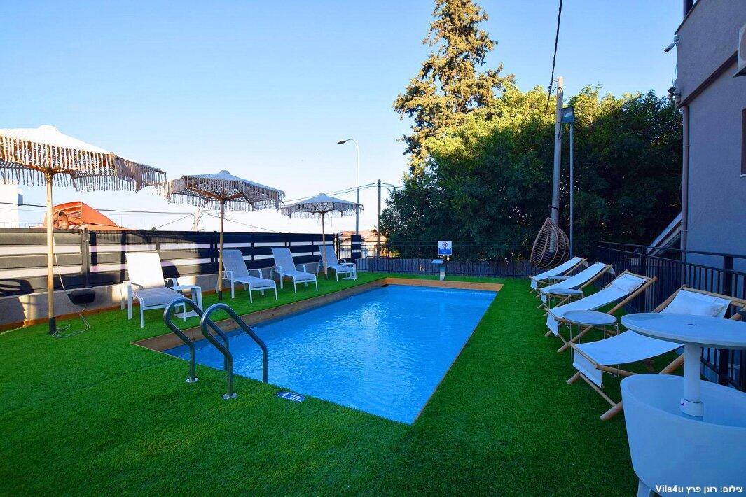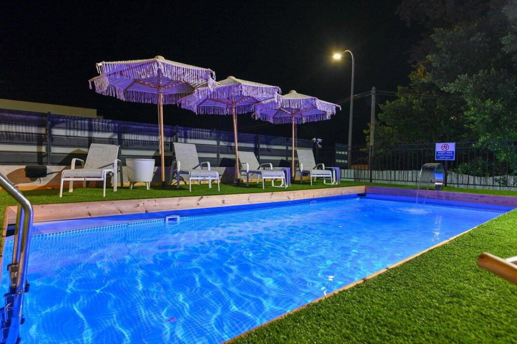במתחם החיצוני תוכלו להנות מבריכת שחייה מחוממת, ג'קוזי ספא מפנק ומקורה, פינות ישיבה נינוחות ומיטות שיזוף, עמדת מנגל, כדורסל אלקטרוני, פינוג פונג ועוד.