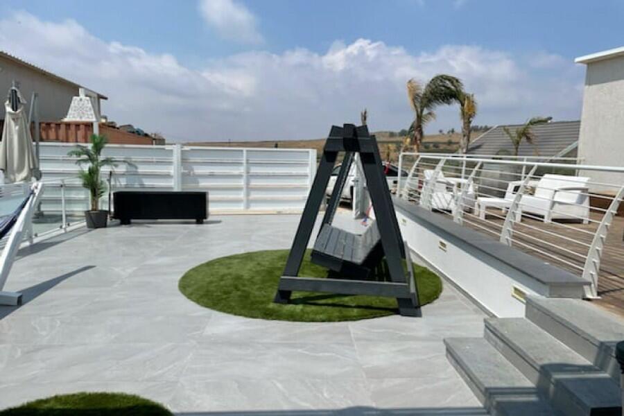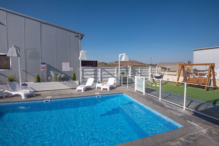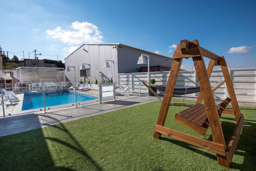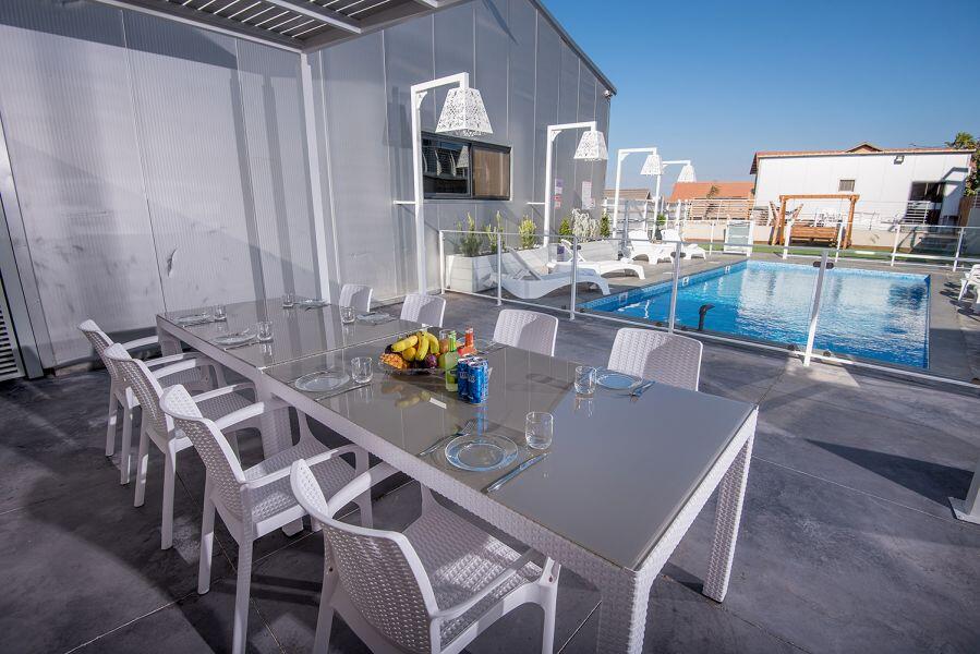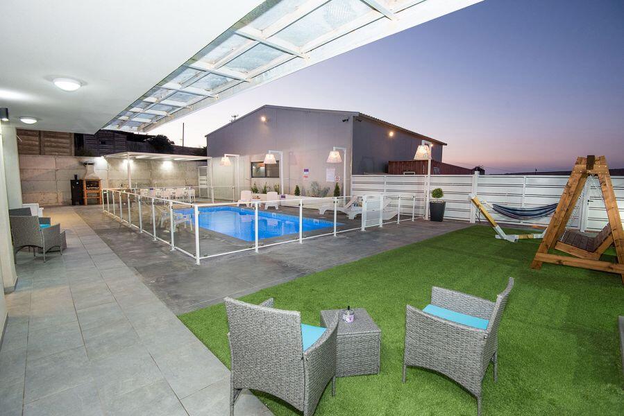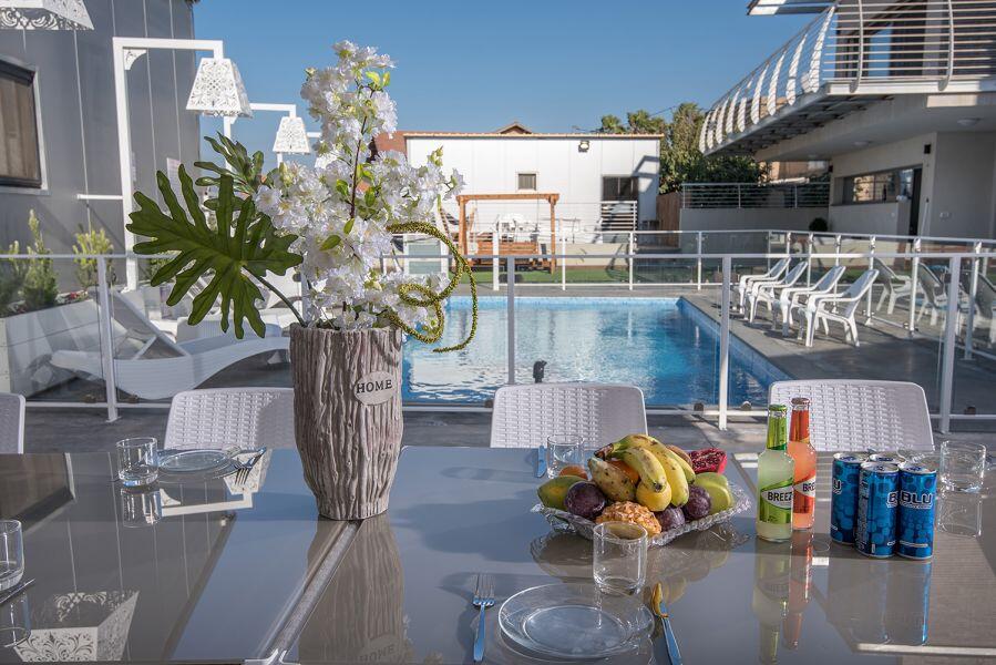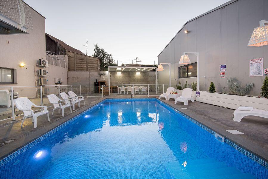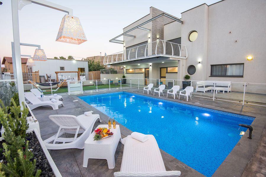 בחצר תוכלו להתפנק מבריכת שחייה גדולה, מחוממת ומקורה, מגוון פינות ישיבה עם שולחנות, ערסלים ונדנדה. בנוסף, ישנו גם ג'קוזי ספא מפנק, שולחן פינג פונג, מטבח חיצוני עם פינת אוכל, עמדת מנגל ועוד.