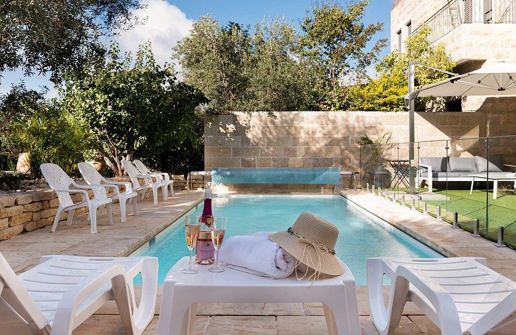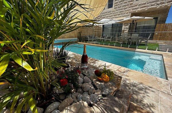 (5 "הוילה"- 3 קומות (4 חדרים) עם מדרגות עץ כולל חצר עם בריכה וחניה צמודה אחת.