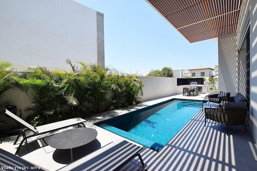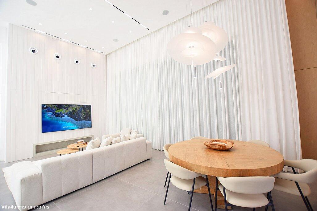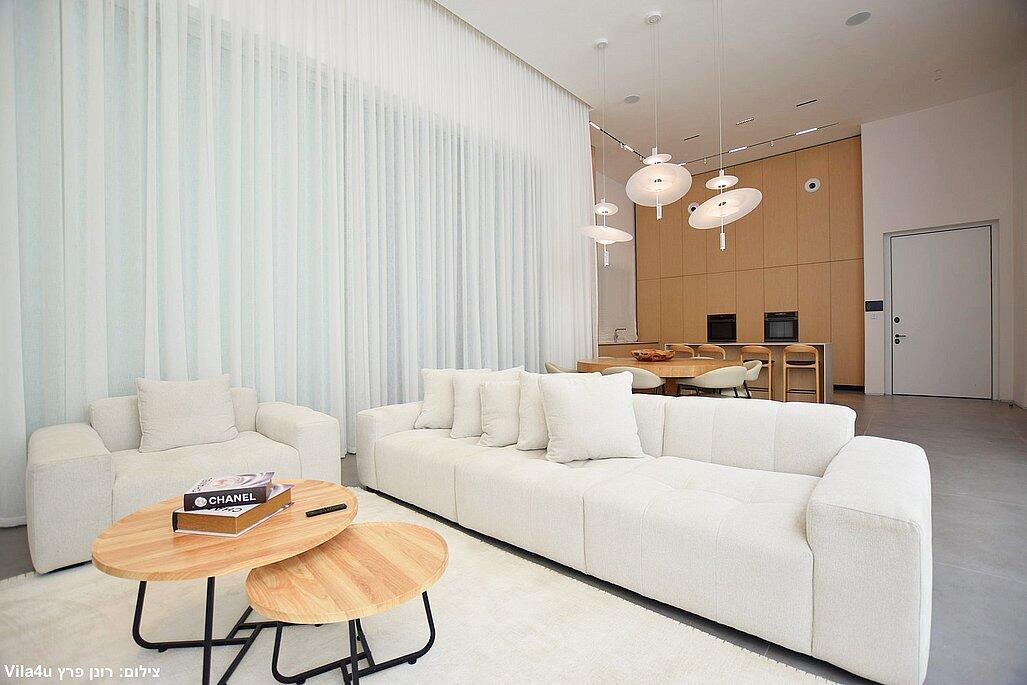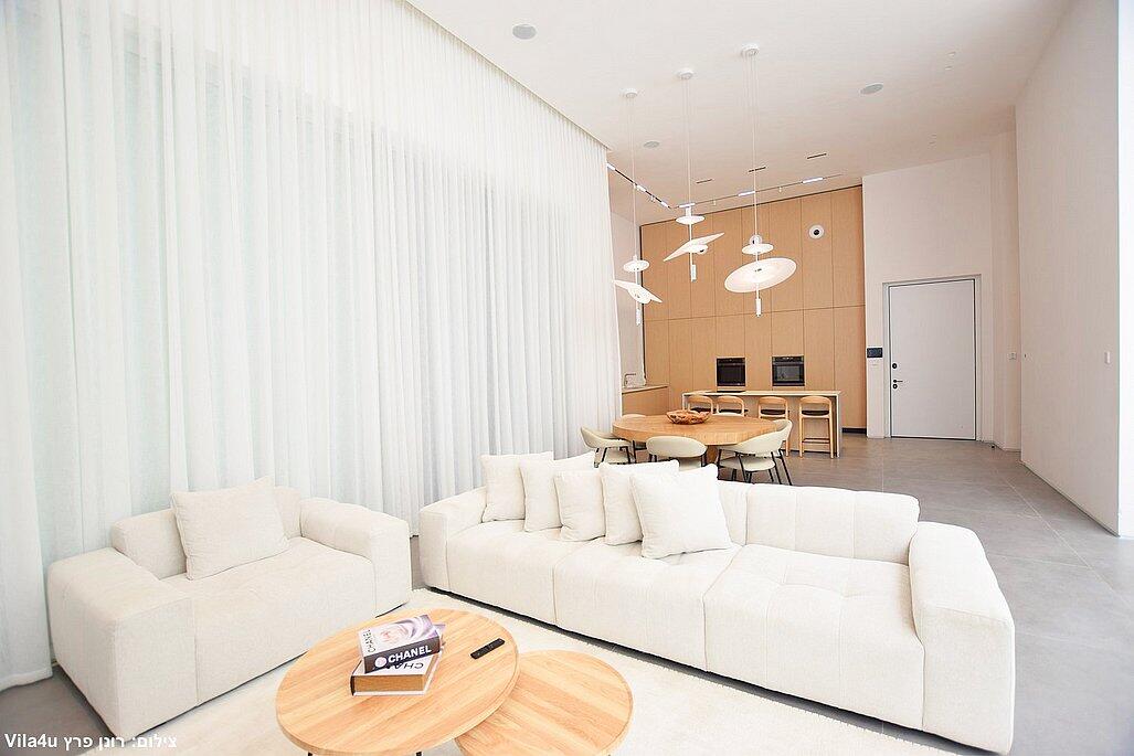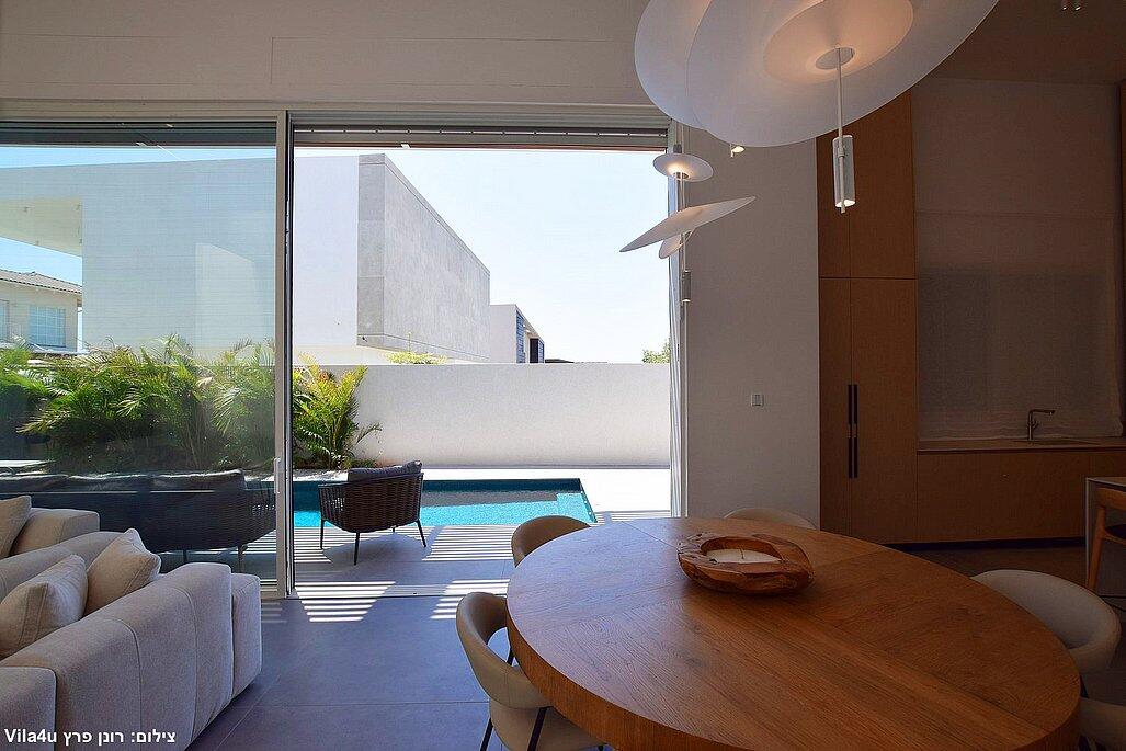 סלון ענק, תקרה בגובה 6 מטרים ומטבח מאובזר לחלוטין, חצר ענקית עם בריכה פרטית, פינת אוכל חיצונית ומטבח חוץ, חניה פרטית ונוף קסום.