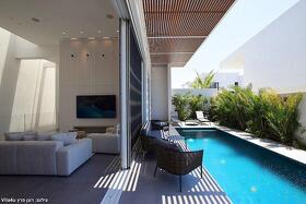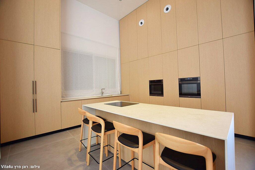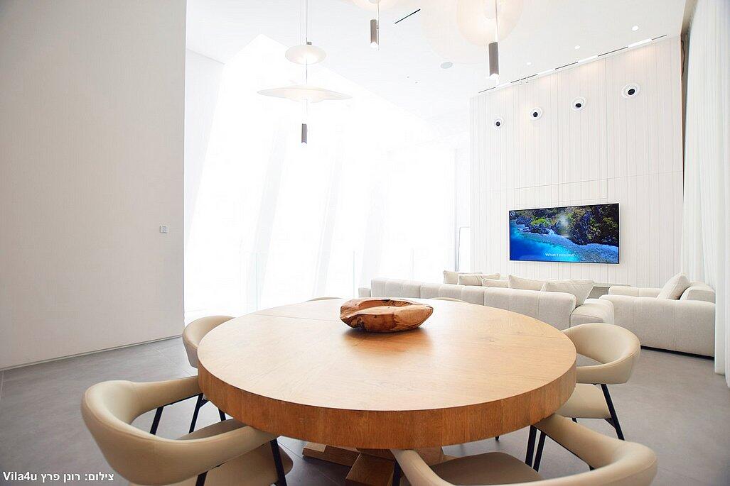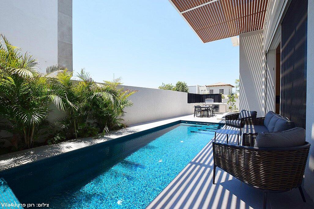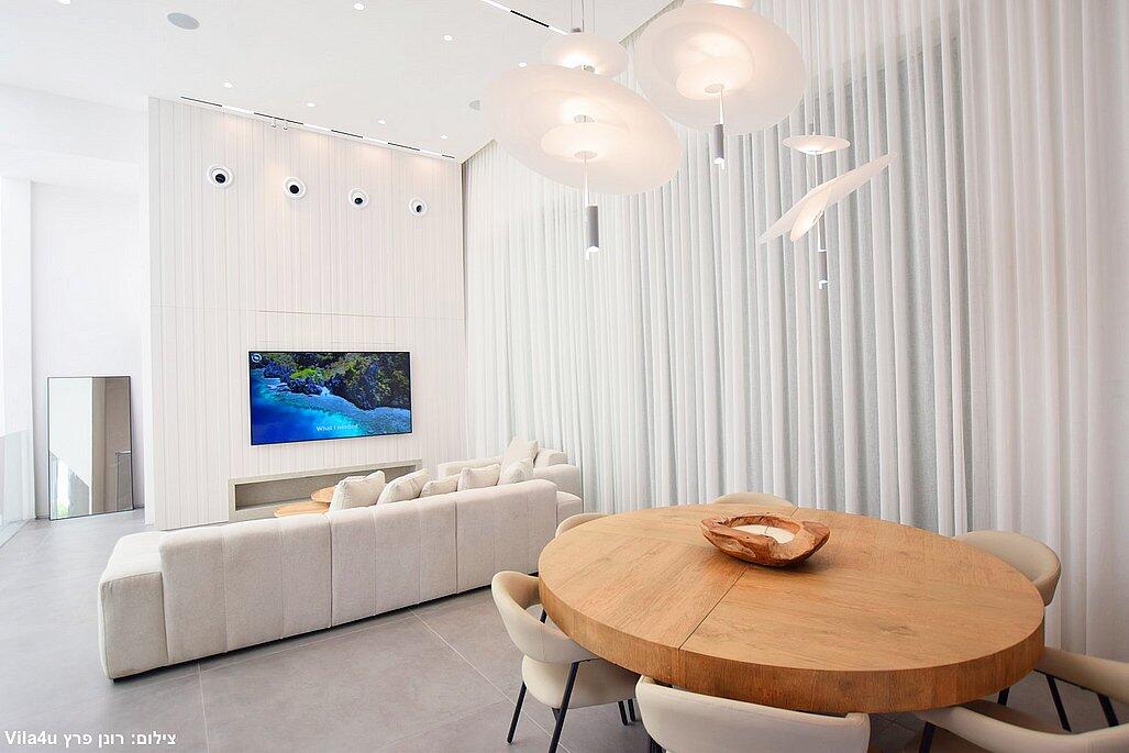 סלון ענק, תקרה בגובה 6 מטרים ומטבח מאובזר לחלוטין, חצר ענקית עם בריכה פרטית, פינת אוכל חיצונית ומטבח חוץ, חניה פרטית ונוף קסום.