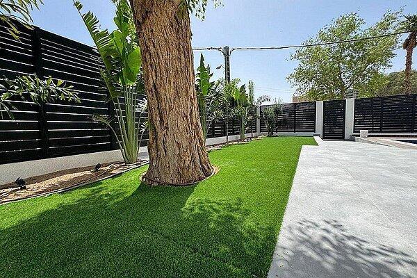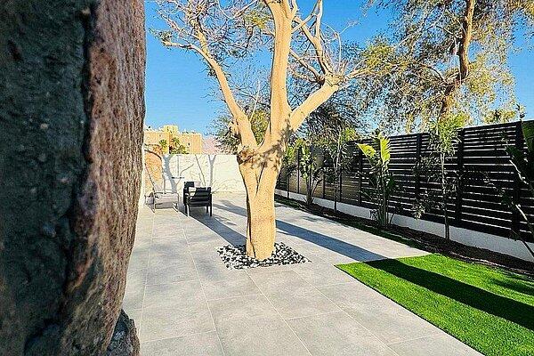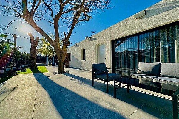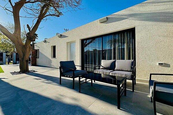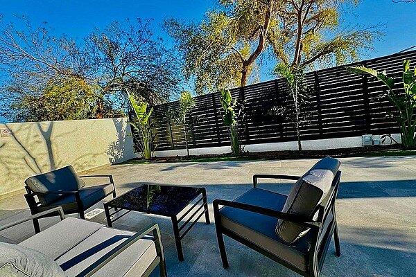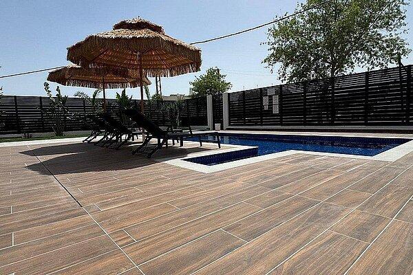החצר של הוילה כוללת בריכת שחייה מפנקת וצלולה, פינת מנגל עם מטבחון ופינת אוכל צמודה, מיטות שיזוף ופינות ישיבה.