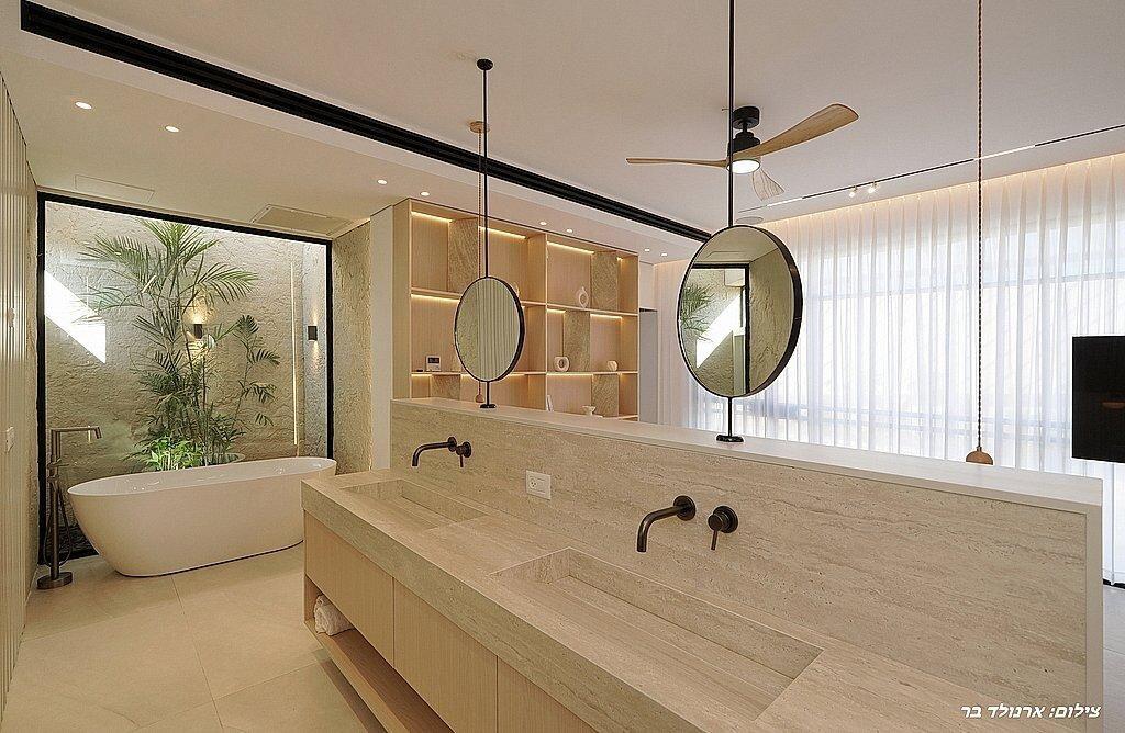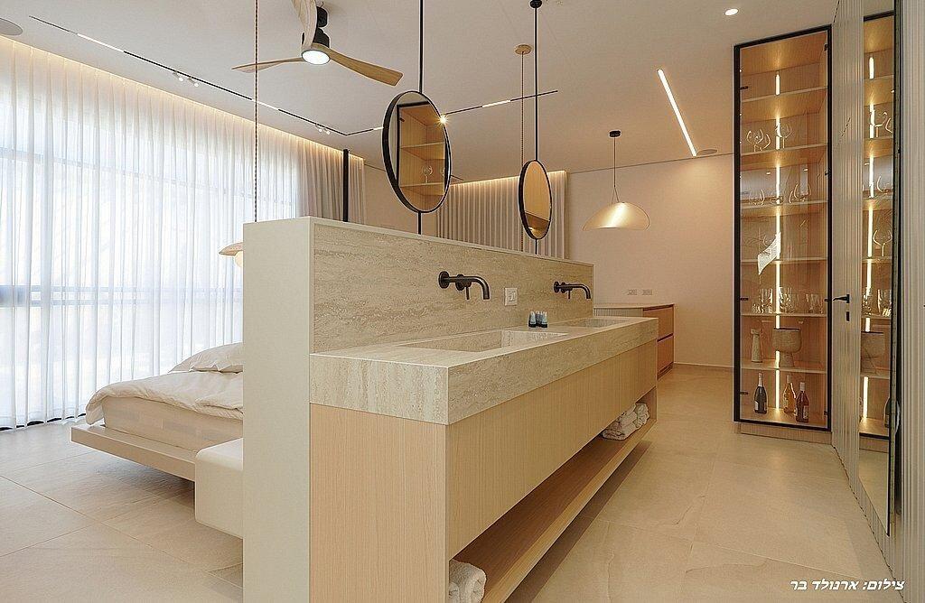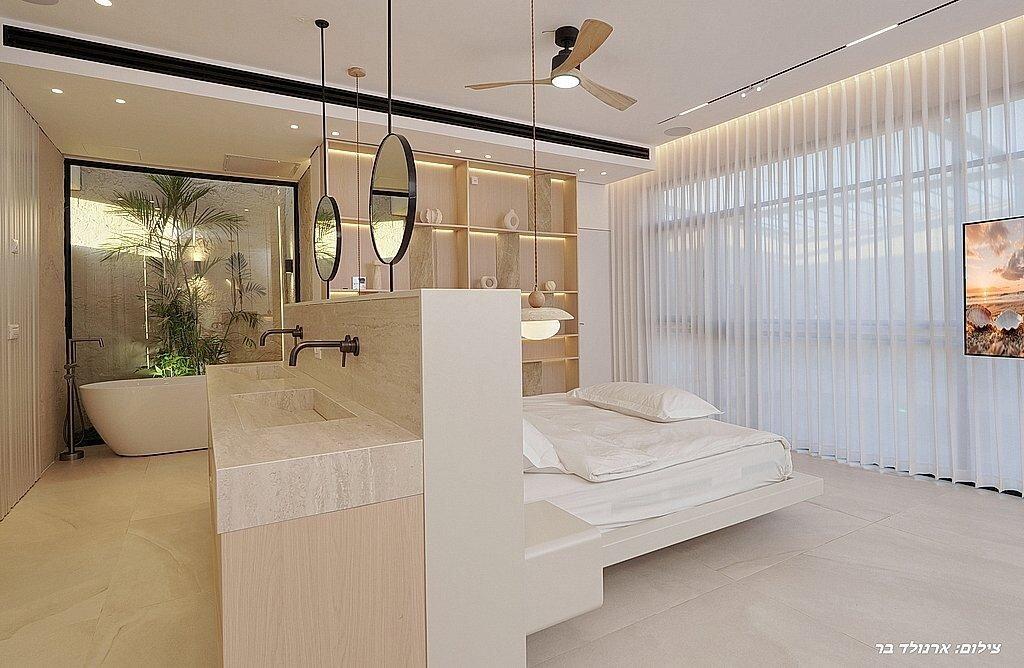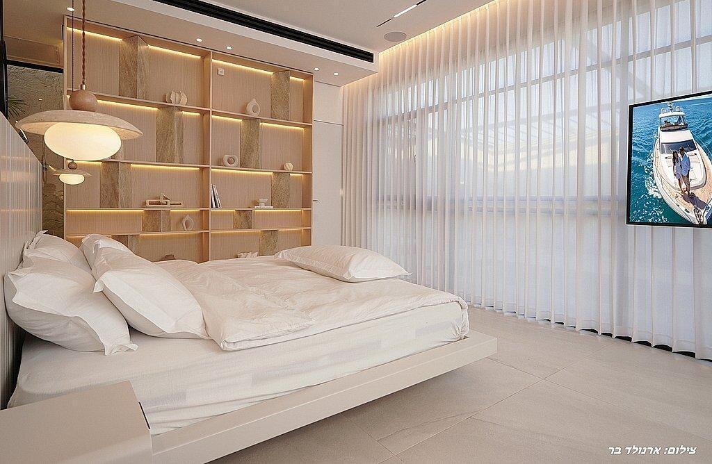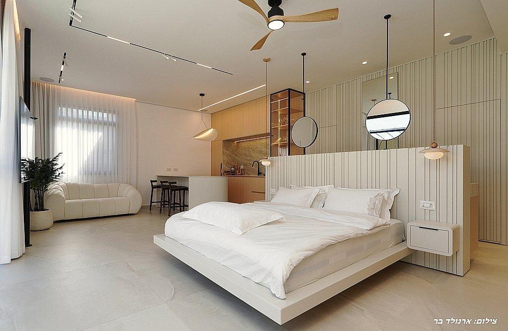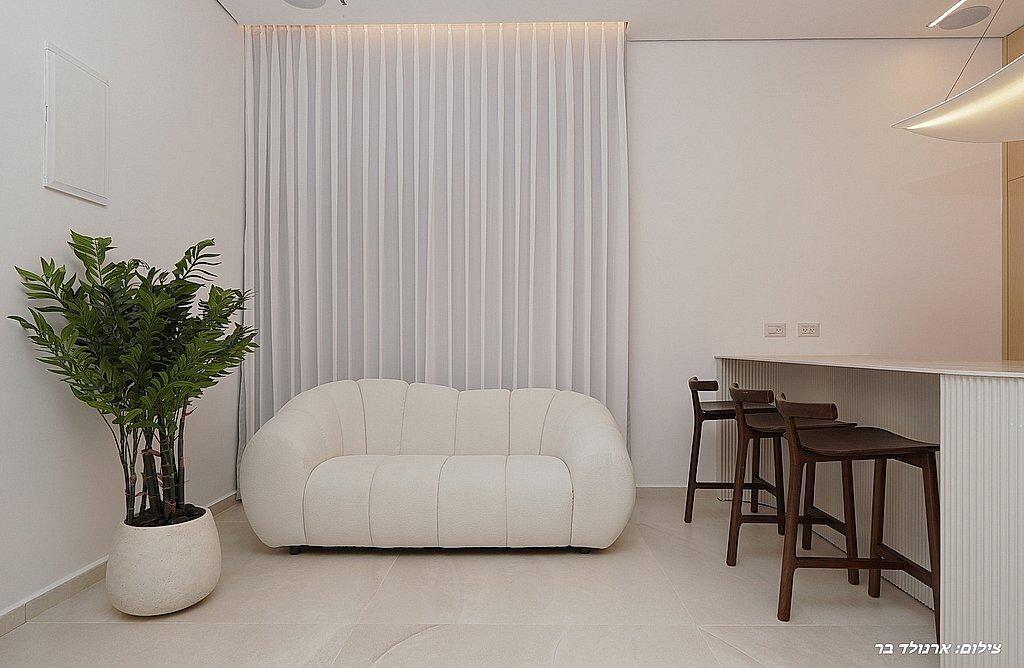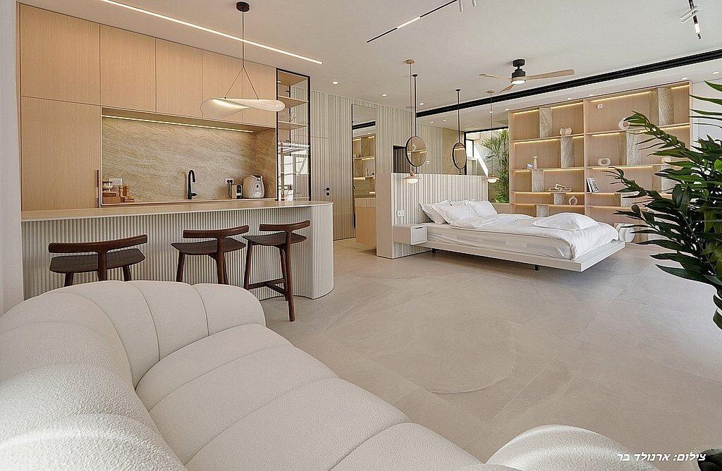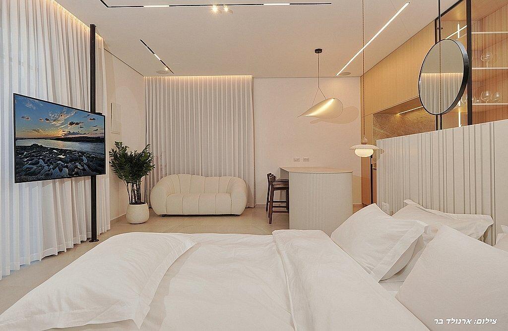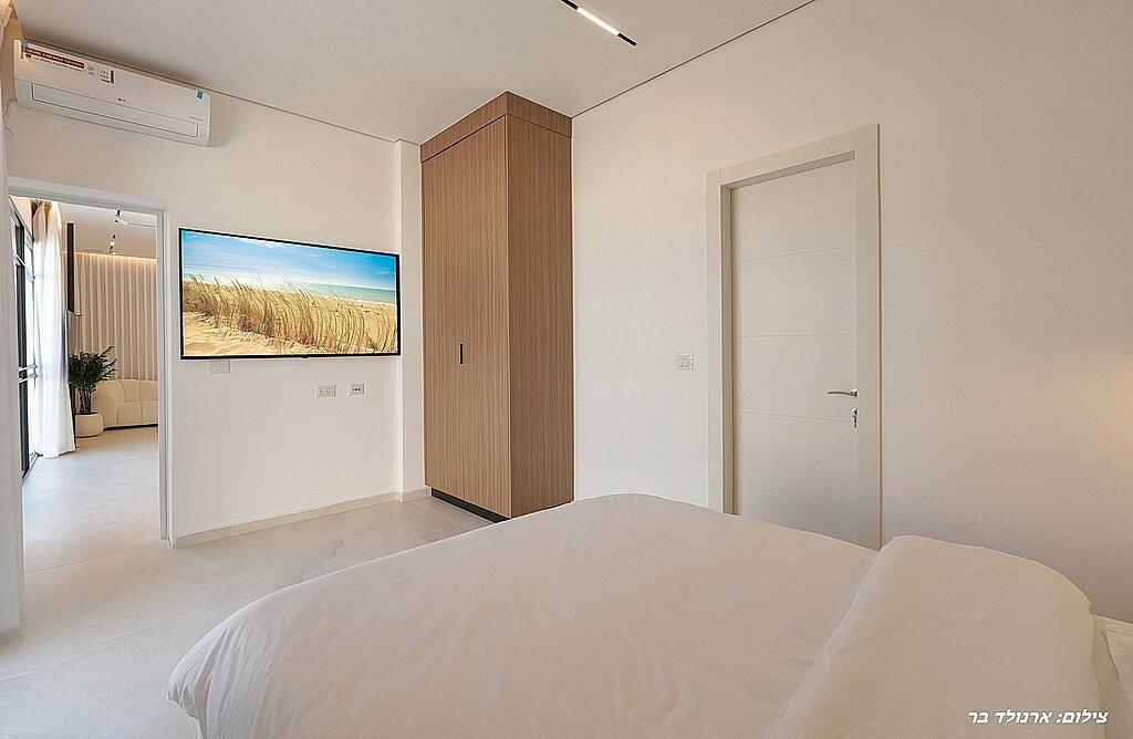 החלל המרכזי נעים ורחב עם סלון וטלוויזיה חכמה 65 אינץ', ושני חדרי שינה מרווחים.