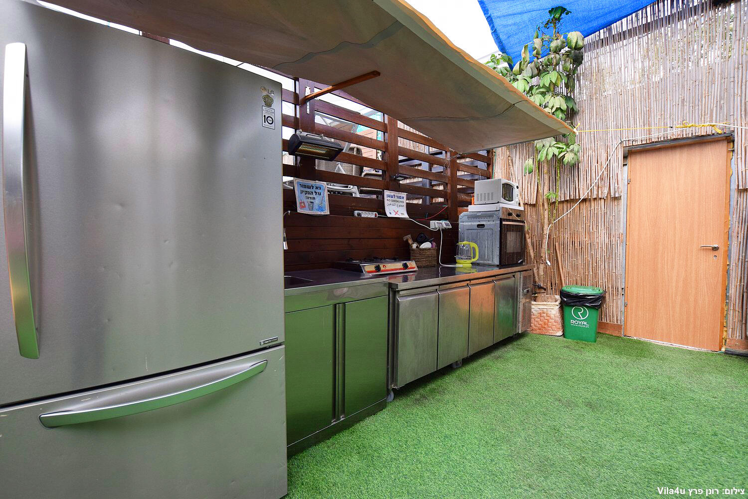 בצידה השני אזור אוכל עד 30 סועדים סועדים כולל מטבח מאובזר וכן פינות ישיבה, ערסלים, נדנדות, שולחן פינג-פונג, אזור ברביקיו, מגרש כדורעף וקט רגל ובוסתן פרי ענק בו מסתובבות חיות מחמד ברוב הפעמים.
