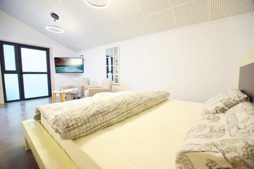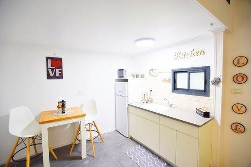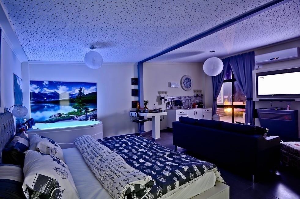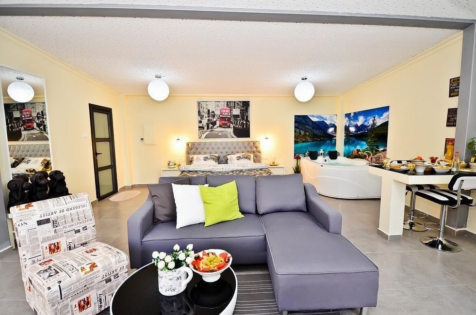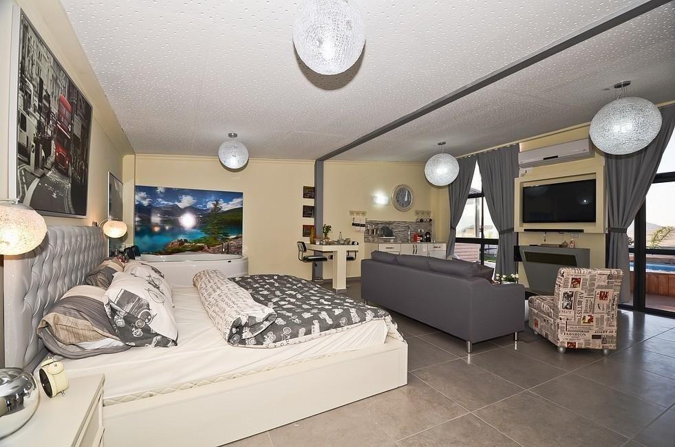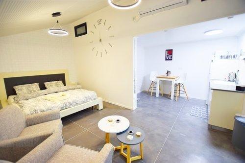 בכל סוויטה מיטה זוגית, מטבחון מאובזר, סלון יוקרתי וחדר רחצה.
